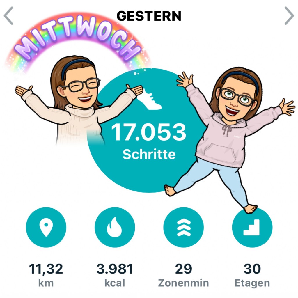 Zur Zeit bin ich bewegungstechnisch wieder sehr gut in Form. Klar, jeden Abend tun mir die Beine weh, aber ich gehe mit einem sehr guten Gefühl ins Bett. Ich versuche täglich meine 10k Schritte zu schaffen. Das gelingt mir wieder sehr gut. Ich räume mir sehr gerne Zeit ein, in den ich mich noch zusätzlich bewegen kann. Mein Mann ist mir da eine sehr große Unterstützung. Meistens drehe ich abends meine Runden und in der Zeit passt er auf unsere Kinder auf. Er bringt sie ins Bett und versorgt sie. Dafür bin ich Ihnen sehr dankbar.